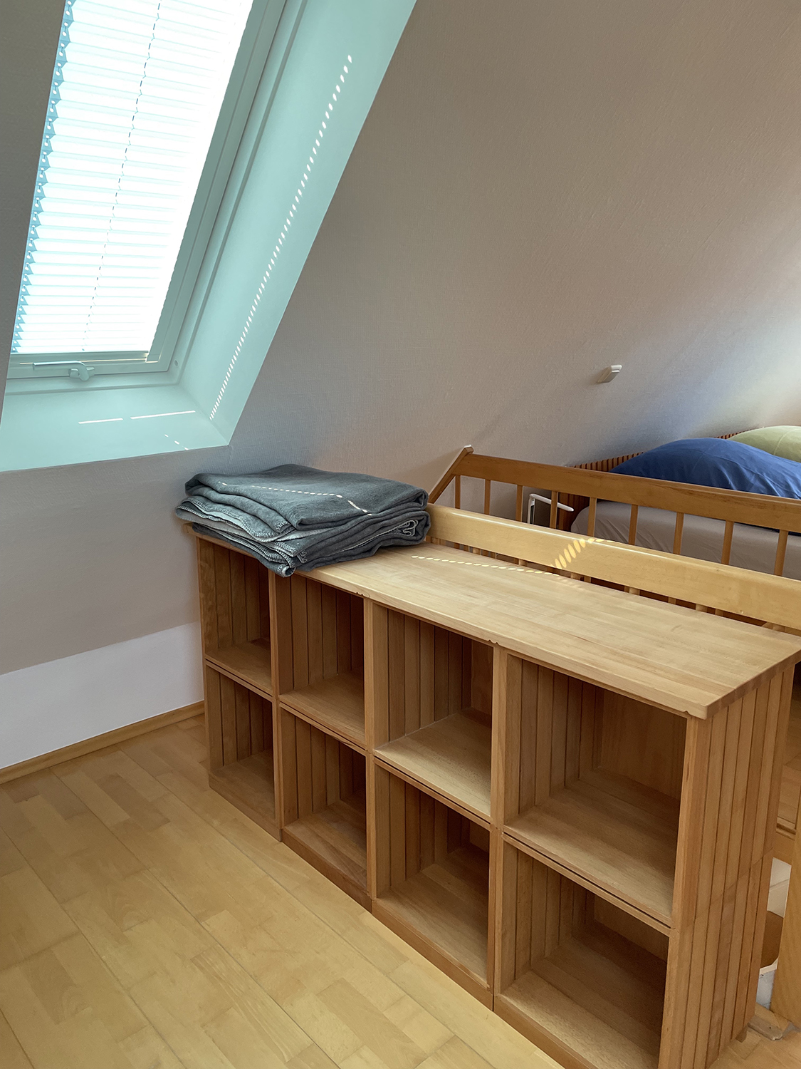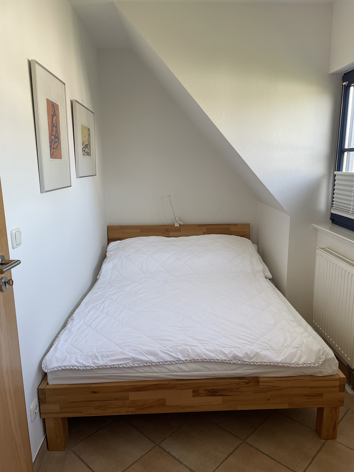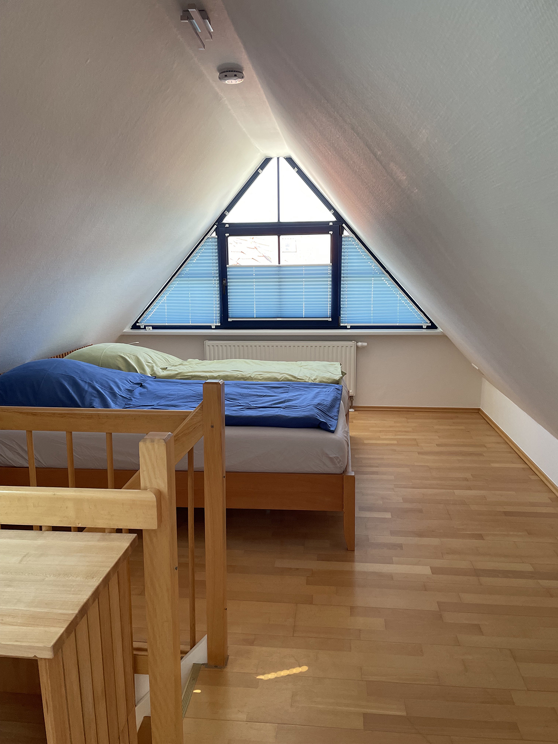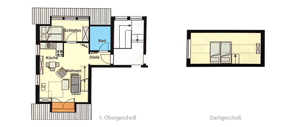 Die Wohnung ist für maximal 4 Personen ausgelegt mit einem Schlafzimmer (Doppelbett 1,40m x 2,00m), sowie einem großen Doppelbett im Dachgeschoß (1,80m x 2,00m). Das Dachgeschoß schließt sich über eine offene Treppe an das Obergeschoß an. Für die Treppe ist im Dachgeschoss ein Treppenschutzgitter vorhanden. In jedem Raum sind Insektenschutzgitter angebracht.