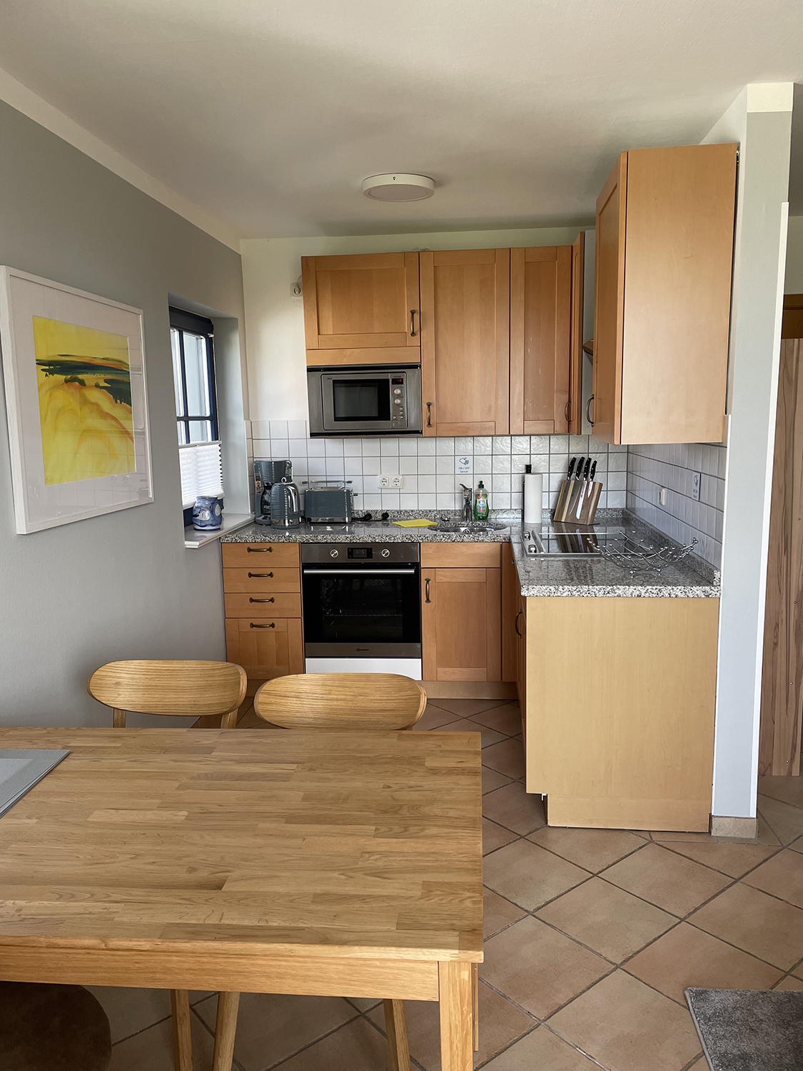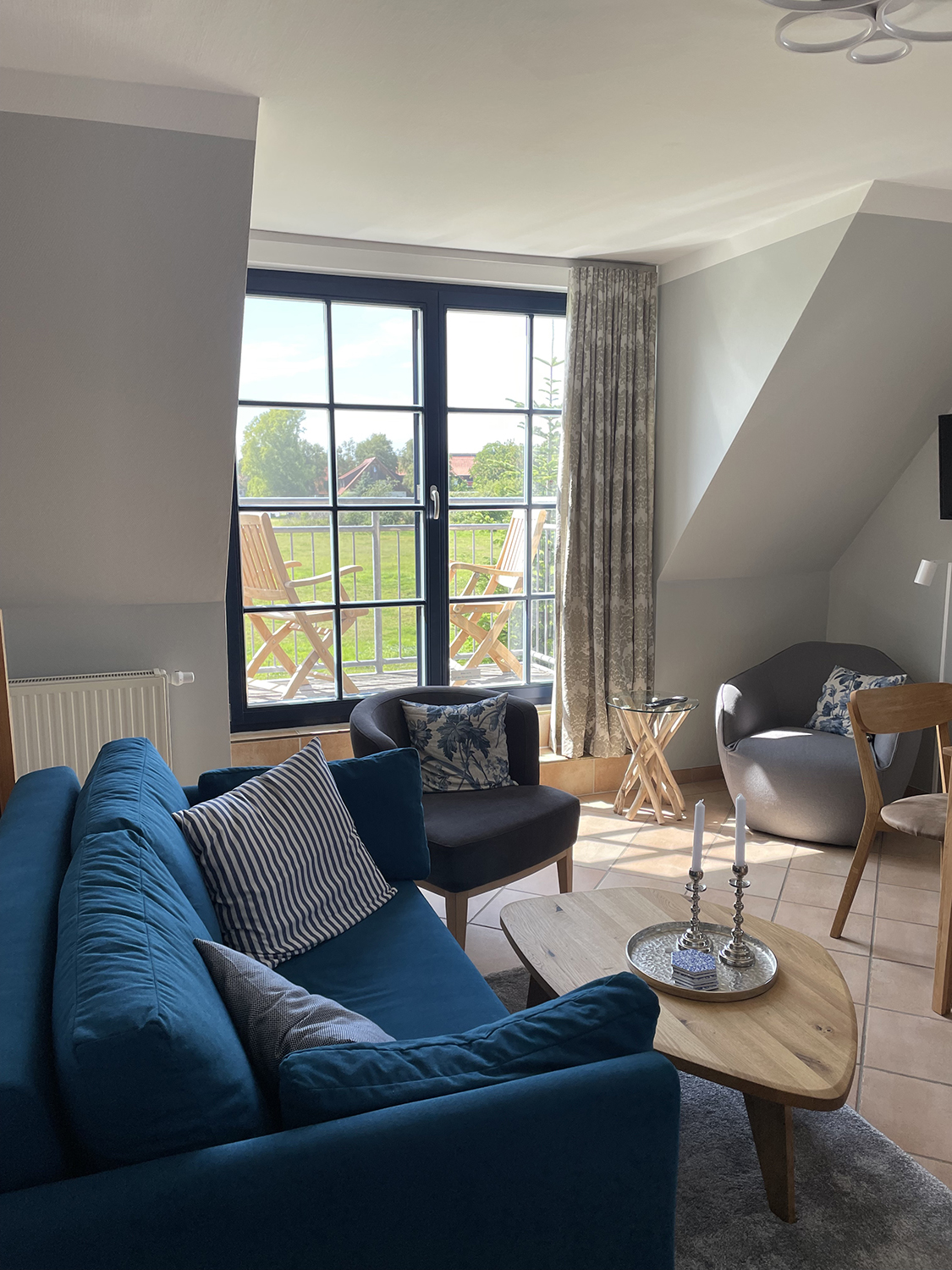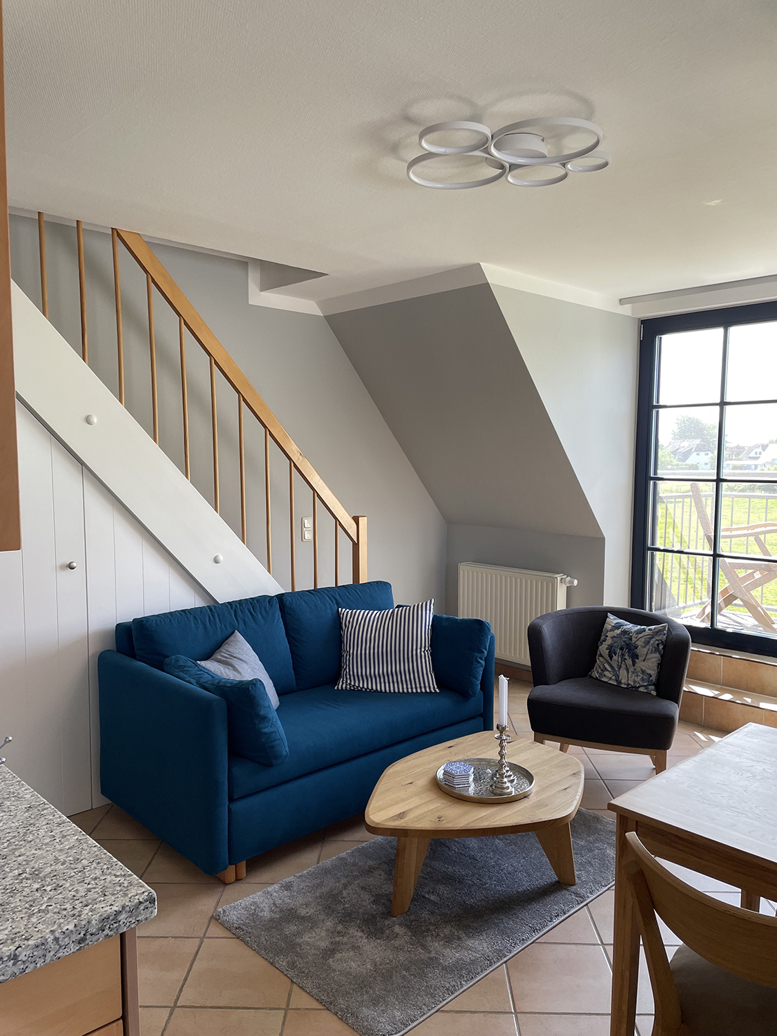 Unsere Ferienwohnung liegt im Ort Vitte, Wiesenweg 32b, Haus Seeschwalbe. Die Wohnung wurde nach Eigentümerwechsel im Jahr 2023 komplett renoviert und neu möbliert. Sie erwartet eine Wohnung von ca. 50 Quadratmeter über 2 Etagen (OG/ DG) mit Balkon. Im Obergeschoß ist ein Balkon mit freiem Blick nach Westen auf die Wiese (oft sehen Sie da die Pferde grasen). Von fern hören Sie die Ostsee rauschen.